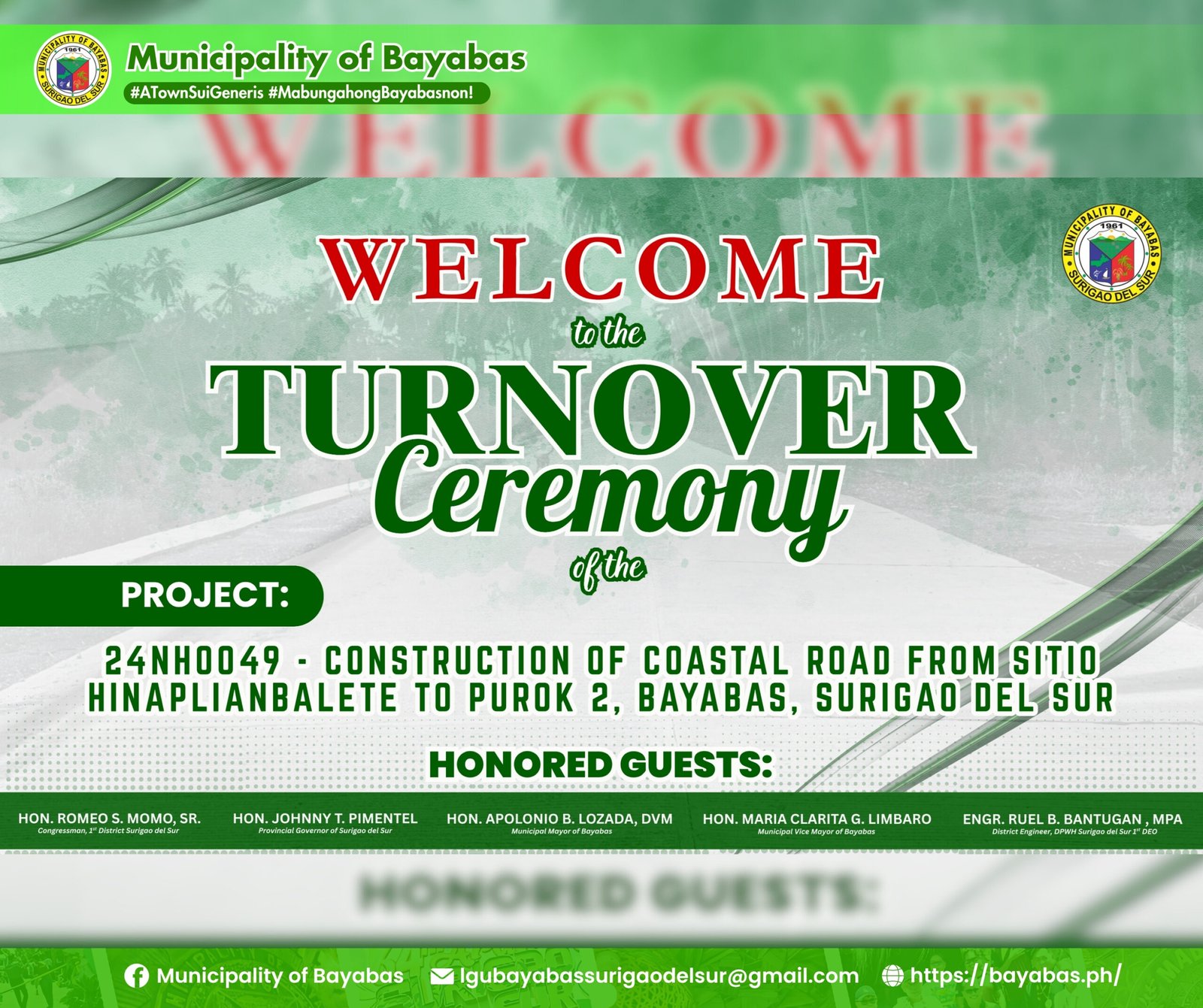 Turn Over Ceremony of the Coastal Road from Sitio Hinaplian, Balete To Purok 2, Bayabas, Surigao del Sur41 Images PMNP | DOH Internal Verification Components 1 & 246 Images Fire Prevention Month 202449 Images KASALANG BAYAN 202495 Images Turn over seven different livelihood projects to seven SLP Associations21 Images Blessing and Ceremonial Turn-over of New Fire Truck33 Images